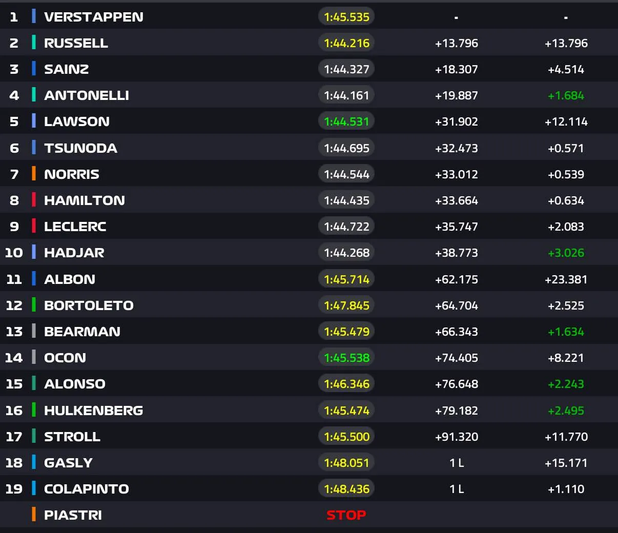 Pri McLarnu so zapravili priložnost, da bi v 38. krogu Landa Norrisa z ‘undercutom’ spravili pred Yukija Tsunodo, saj je njegov postanek v boksih trajal dolgih 4,1 sekunde. Tudi Ferrari je doživel razočaranje. Lewis Hamilton in Charles Leclerc sta po obetavnih prostih treningih končala šele kot osmi in deveti.