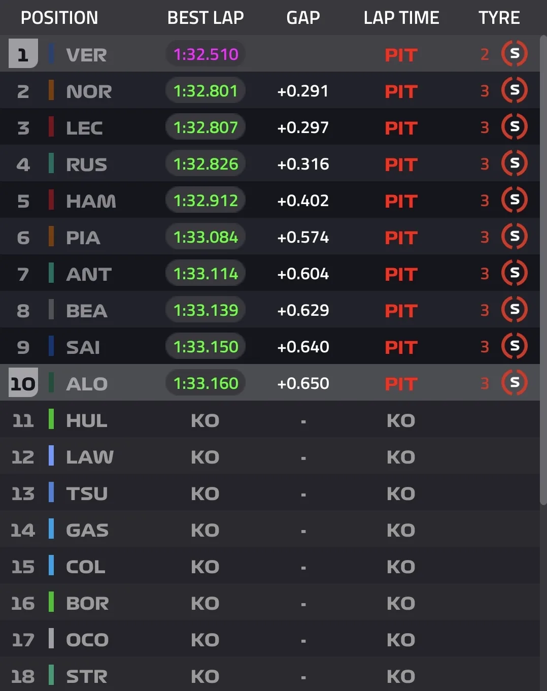 Zadnji del kvalifikacij je bil izjemno napet. Verstappen je že pet minut pred koncem postavil čas 1:32,5, s katerim si je zagotovil že drugi pole position ta konec tedna. Ferrari se je tokrat mučil, predvsem v uvodnih krogih, ko je Leclerc zdrsnil s steze, medtem ko je Hamilton blokiral kolesa.