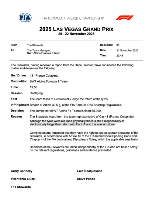 Colapinto tako ni prejel kazni, namesto njega je FIA namreč oglobili ekipo. Komisarji so potrdili, da bo moral Alpine moral plačati 5.000 evrov globe.