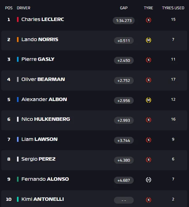 Svetovni prvak Lando Norris je s svojim McLarnom zasedel drugo mesto (1:34.784), je pa bil s 64 krogi najbolj dejaven na stezi. Prvo trojico je zaokrožil Pierre Gasly z Alpinom, medtem ko sta Oliver Bearman in Alex Albon dopoldne končala na četrtem oziroma petem mestu.