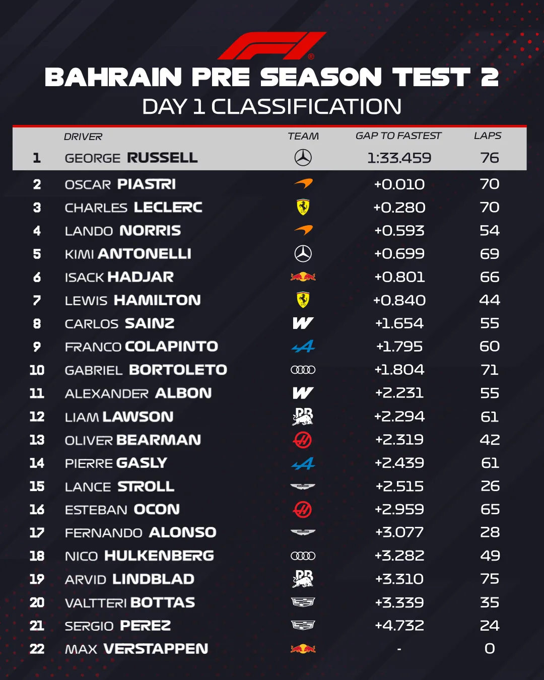 George Russell je ob koncu prvega dne testiranj Formule 1 v Bahrajnu postavil najhitrejši čas, s čimer je le za nekaj tisočink sekunde prehitel Oscarja Piastrija.