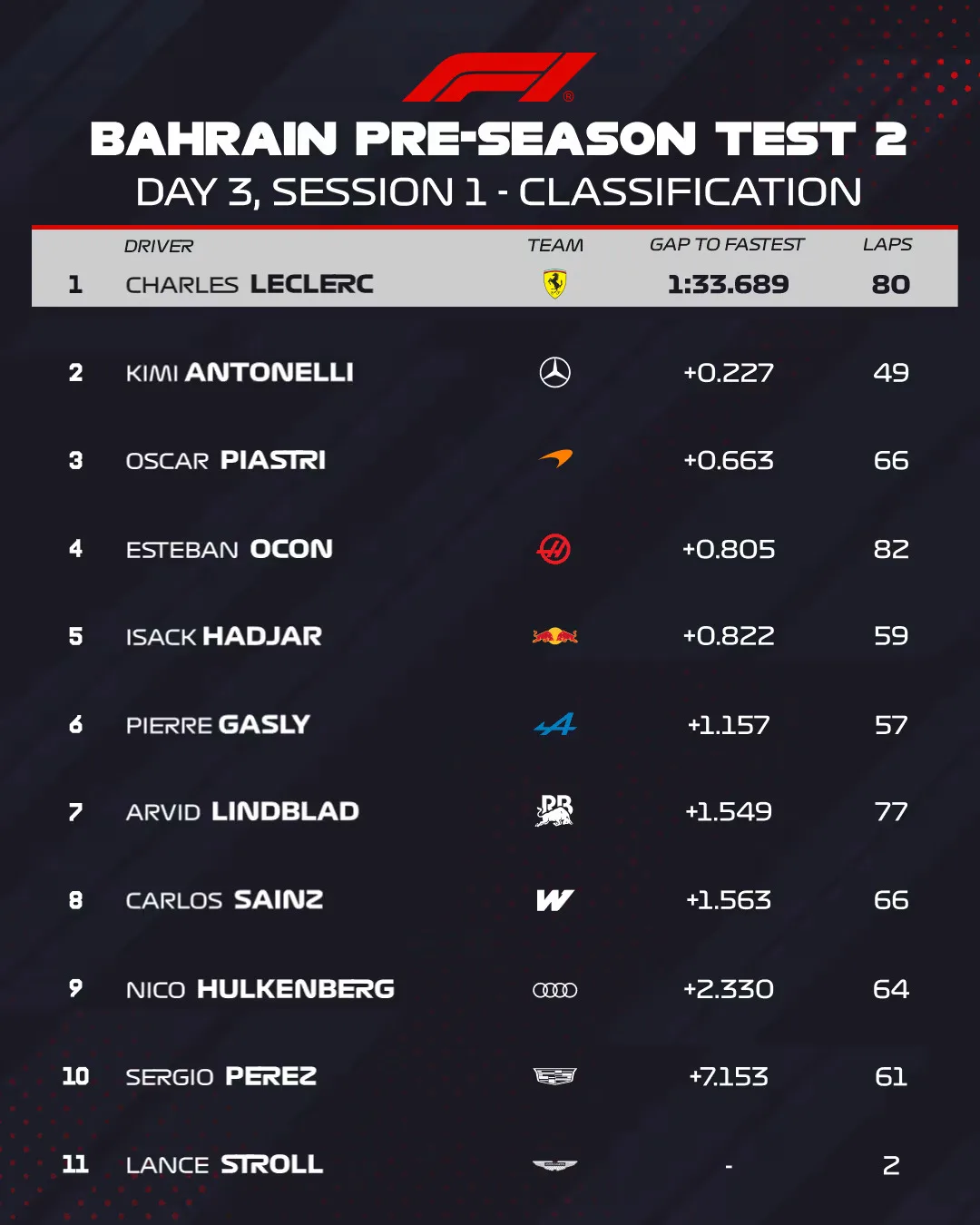Medtem ko je Leclerc na čelu kolone še naprej izboljševal svoj čas, je ekipa Aston Martin prejela pomembno posodobitev od dobavitelja motorjev Honda glede težav, s katerimi se je ekipa nenehno srečevala med svojim predsezonskim testiranjem. Tudi Oscar Piastri v McLarnu se je prebil v ospredje, čeprav s časom, ki je bil za dve desetinki slabši od Leclercovega.