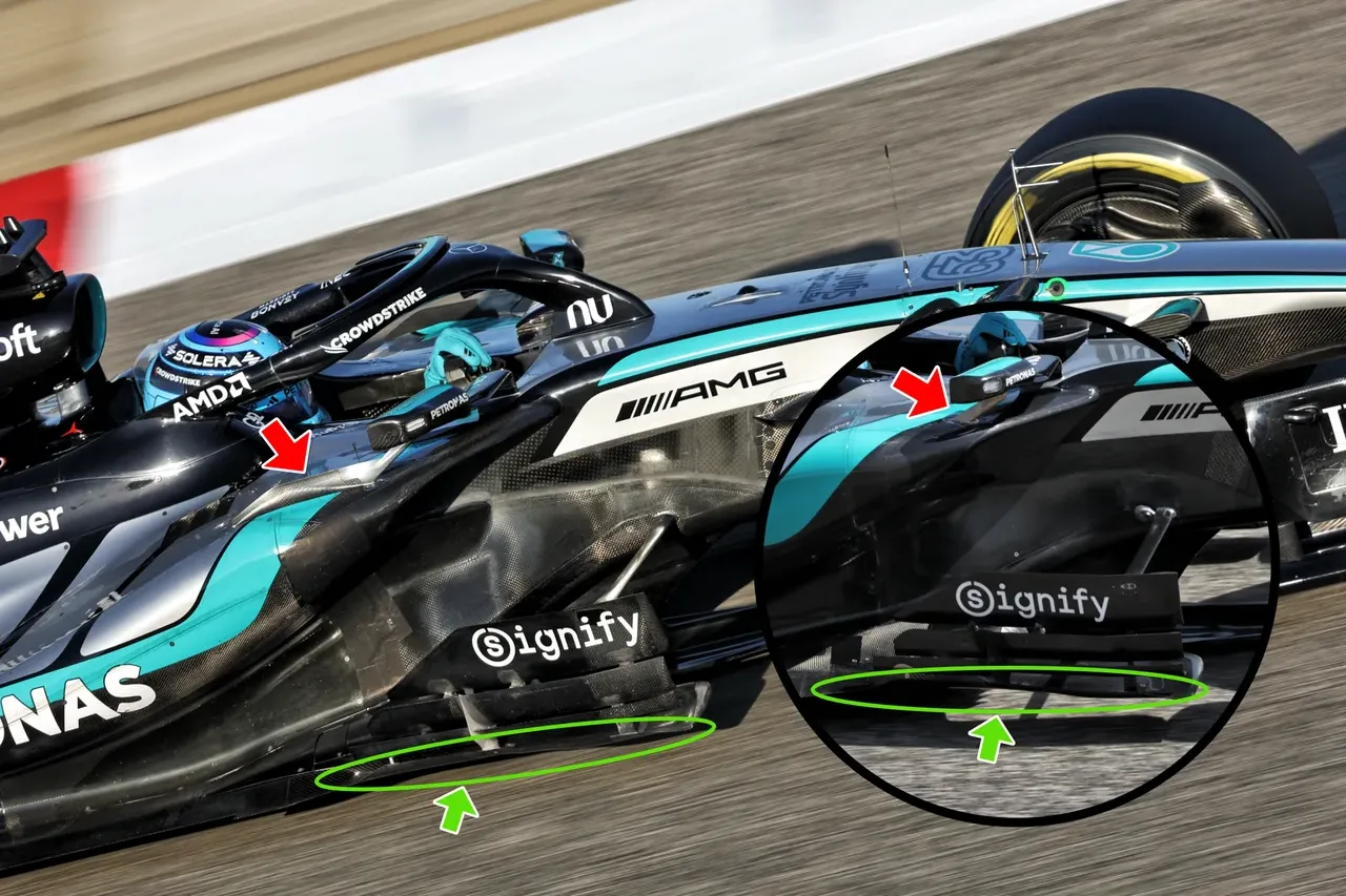 Če začnemo analizirati spremembe na dnu, so Mercedesovi inženirji uvedli vidne spremembe na spodnjem delu dna. Kot je razvidno na spodnji fotografiji, je dno pod usmerjevalnikom zraka na koncu upognjeno, zadnji rob pa je bil odrezan, da ustvari serijo majhnih vrtincev, ki zatesnijo rob in preprečijo, da bi turbulenca s sprednjih pnevmatik prodrla pod dno. Poleg tega je nosilec ogledala postal pravo krilce. V primerjavi s prejšnjo različico ima novi nosilec podolgovato in upognjeno obliko, ki ustvarja serijo vrtincev ob strani, s čimer zmanjšuje odstopanje tekočinske plasti, ki se običajno pojavi v tisti regiji.