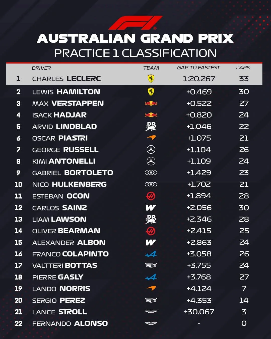 Številne ekipe, vključno z Aston Martinom, McLarnom, Williamsom in Racing Bullsi, so se v prvih 60 minutah petkovega treninga soočale s težavami. Fernando Alonso ni uspel odpeljati niti enega kroga, medtem ko jih je Lance Stroll opravil skupno tri.