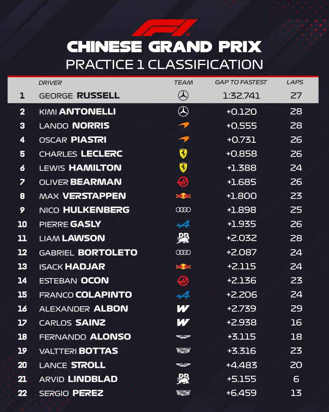 Britančev čas 1:32,741 je zadostoval za prvo mesto, njegov moštveni kolega Kimi Antonelli je zaostal za nekaj več kot desetinko na drugem mestu, Norris z McLarnom pa je zasedel tretje mesto s pol sekunde zaostanka.